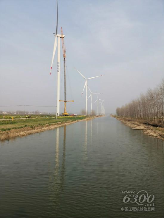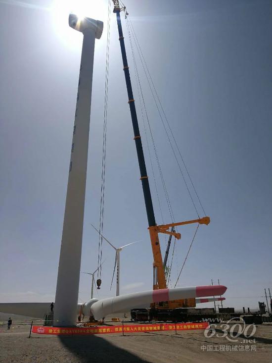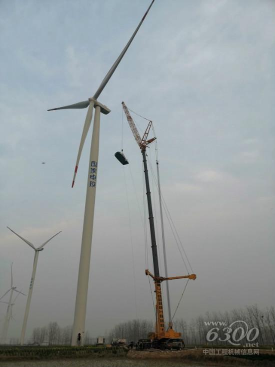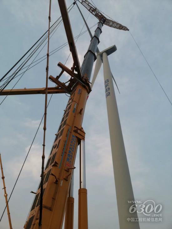江蘇省鹽城市濱海港風電場,塔筒高度130米,槍艙3噸,電機軸承1噸,QAY650A采用主臂74.7米+變幅副臂56米,87噸配重的工況,將目標吊至134米高處。