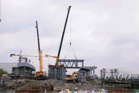 江蘇鹽城東臺站天橋施工現(xiàn)場,天橋桁架橫跨一、二、三站臺,跨度44.6m,桁架重118.3t,QAY650A大氣不喘分兩段吊裝完成。