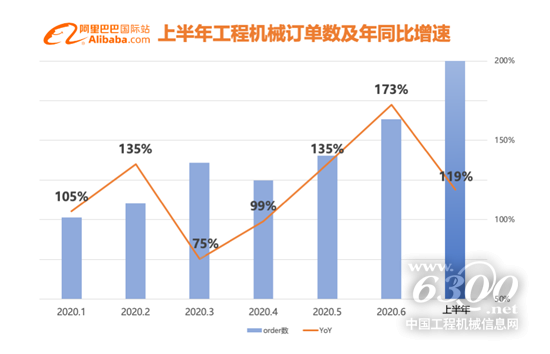作為全球最大的B2B跨境電商平臺(tái),阿里巴巴國際站依托沉淀21年的大數(shù)據(jù)、數(shù)字技術(shù),和一站式跨境供應(yīng)鏈服務(wù)體系,打造數(shù)字化新外貿(mào)。疫情之下,數(shù)字化新外貿(mào)持續(xù)逆勢高速增長。今年上半年,阿里巴巴國際站交易額同比增長80%,訂單數(shù)同比增長98%,支付買家數(shù)同比增長60%。工程機(jī)械產(chǎn)品是中國外貿(mào)出口的第一大品類,同時(shí)也是阿里巴巴國際站的第一大行業(yè)。上半年,工程機(jī)械類產(chǎn)品在國際站的訂單數(shù)月均增速達(dá)119%,6月份增速升至175%。