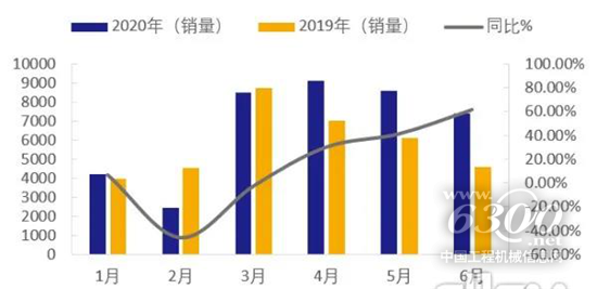 據(jù)中國工程機(jī)械工業(yè)協(xié)會(huì)統(tǒng)計(jì),2020年6月工程起重機(jī)四類起重機(jī)產(chǎn)品共銷售7380臺(tái),同比2019年增加2800臺(tái),增長61%,表現(xiàn)堪比挖掘機(jī)市場。2020年1-6月起重機(jī)四類產(chǎn)品累計(jì)銷量超4萬臺(tái),與2019年同期相比增長13.5%。其中國內(nèi)市場銷售38261臺(tái),同比增長14%左右。傳統(tǒng)淡季疊加疫情影響,2020年一季度起重機(jī)銷量略有下滑,二季度開始回暖,增速快速回升(41.7%),4月份銷量為上半年月度最高。具體到機(jī)型,汽車起重機(jī)銷量增幅最大,略高于行業(yè)平均水平,而輪胎起重機(jī)銷量呈負(fù)增長。