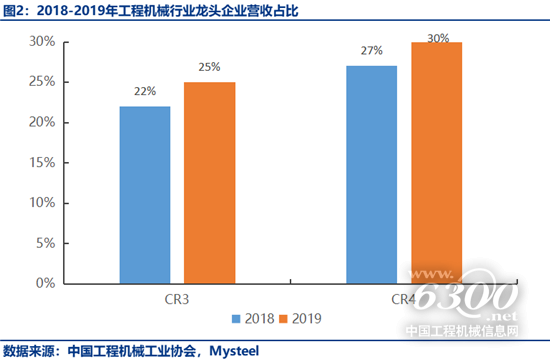 據(jù)中國工程機械工業(yè)協(xié)會統(tǒng)計數(shù)據(jù),2019年納入統(tǒng)計的311家工程機械行業(yè)企業(yè),實現(xiàn)營收6681億,同比增長12%。其中,前3家企業(yè)(三一、徐工、中聯(lián)重科)共計實現(xiàn)營收約1782億,占整個行業(yè)營收的27%;前4家企業(yè)(三一、徐工、中聯(lián)重科、柳工)共計實現(xiàn)營收1974億,占工程機械行業(yè)總營收的30%。工程機械行業(yè)財富向龍頭企業(yè)聚集效應(yīng)明顯。