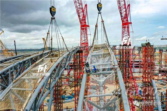 今年5月7日亞青會主場館進(jìn)行鋼結(jié)構(gòu)首吊,7月12日亞青會主場館跨度最大的鋼結(jié)構(gòu)管件——巨型拱桁架啟動吊裝,經(jīng)過中建八局南方公司建設(shè)者們近四個(gè)月的奮力拼搏,8月30日,隨著最后一品桁架吊裝拼接完成,宣告全部鋼結(jié)構(gòu)建設(shè)完成。