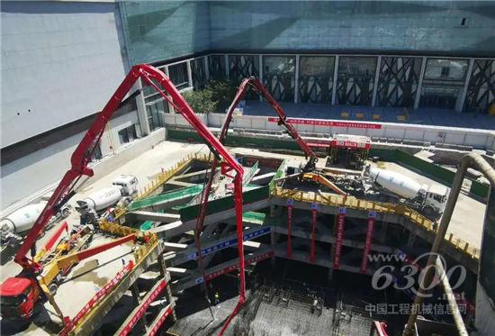 由三一泵送設(shè)備參建的寧波“超級(jí)地標(biāo)”——寧波中心大廈,歷經(jīng)55個(gè)小時(shí)高強(qiáng)度連續(xù)施工,于上月完成了2.2萬(wàn)方混凝土基礎(chǔ)底板澆筑。創(chuàng)造了寧波地區(qū)民用建筑中臨近地鐵最深基坑、超厚基礎(chǔ)底板的一次性連續(xù)澆筑紀(jì)錄。為確保4.2米厚、鋼筋含量達(dá)5200噸的2.2萬(wàn)立方米高性能混凝土一次性澆筑成型,項(xiàng)目部組織了200余名建設(shè)者投入大會(huì)戰(zhàn)。三一重工5臺(tái)56米泵車、2臺(tái)49米泵車全程參與此次建設(shè),為工程保駕護(hù)航。