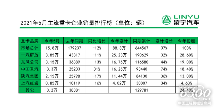 具體來看,在由解放、東風和重汽組成的重卡第一陣營中,一汽解放繼續(xù)保持領(lǐng)先地位,5月份銷售重卡約3.85萬輛;今年1-5月,解放重卡累計銷售25.23萬輛,同比增長32%,市場占有率為28.6%。