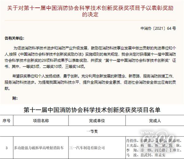 2.三一重工:多功能強力破拆舉高噴射消防車榮獲科學技術(shù)創(chuàng)新獎一等獎