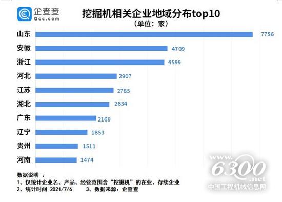 企查查數(shù)據(jù)顯示,目前我國現(xiàn)存“挖掘機”相關(guān)企業(yè)共4.8萬家。2019年是企業(yè)注冊量的高峰期,新增1.1萬家,同比增長38.6%;2020年注冊量下跌36.2%;2021年上半年新增2023家企業(yè),同比下跌了52.4%。從省份分布來看,山東省以0.78萬家企業(yè)位列第一,其次是安徽、浙江。