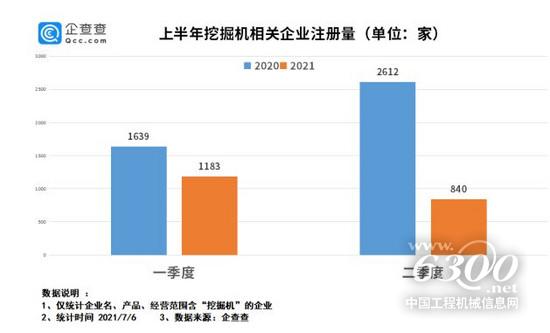 從今年的注冊量來看,2021年上半年,我國挖掘機企業(yè)注冊量為2023家,同比下跌了52.4%。從各季度注冊量來看,今年第一季度注冊量較多,共注冊了1183家相關(guān)企業(yè)。