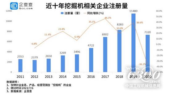 企查查數(shù)據(jù)顯示,從近十年挖掘機相關(guān)企業(yè)發(fā)展?fàn)顩r來看,2019年是挖掘機相關(guān)企業(yè)注冊量的高峰期,全年共注冊了1.15萬家企業(yè),同比增長了38.6%。