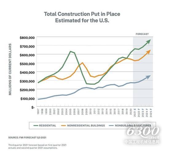 就住宅建設的實際美元金額而言,2020年估計為 6600 億美元。非住宅建筑最高可達 5240 億美元,非建筑最高可達 2810 億美元。