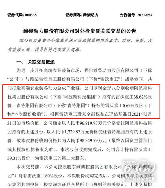 7月13日,濰柴動(dòng)力發(fā)公告稱,公司擬以現(xiàn)金形式分別收購(gòu)阿波斯科技集團(tuán)持有的雷沃重工38.62%股份、青特集團(tuán)持有的雷沃重工0.69%股份。股份收購(gòu)價(jià)格共為人民幣9.85億元。本次股份收購(gòu)?fù)瓿珊?,濰柴動(dòng)力合計(jì)持有雷沃重工39.31%股份,為雷沃重工的第二大股東。