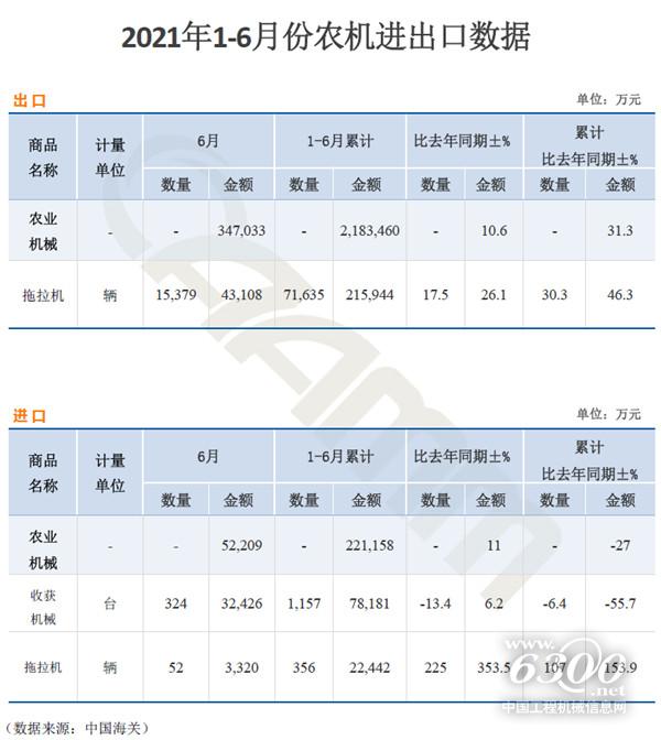根據(jù)中國(guó)海關(guān)數(shù)據(jù),2021年1-6月份,農(nóng)業(yè)機(jī)械出口金額218.35億元,同比增長(zhǎng)31.3%,進(jìn)口金額22.1億元,同比下降27%。1-5月份,累計(jì)出口拖拉機(jī)71,635臺(tái),同比增長(zhǎng)30.3%;累計(jì)進(jìn)口拖拉機(jī)356臺(tái),同比增長(zhǎng)107%,進(jìn)口收獲機(jī)械1157臺(tái),同比下降6.4%。