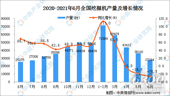 工程機(jī)械銷量在2016年至2019年期間實(shí)現(xiàn)了高增長(zhǎng)。挖掘機(jī)作為工程機(jī)械景氣程度的標(biāo)志性產(chǎn)品,自2016年下半年工程機(jī)械行業(yè)復(fù)蘇以來(lái),我國(guó)挖掘機(jī)產(chǎn)銷量保持高速增長(zhǎng)。最新數(shù)據(jù)顯示,2021年6月全國(guó)挖掘機(jī)產(chǎn)量27284臺(tái),同比下降25.7%。