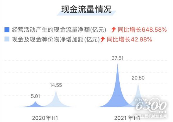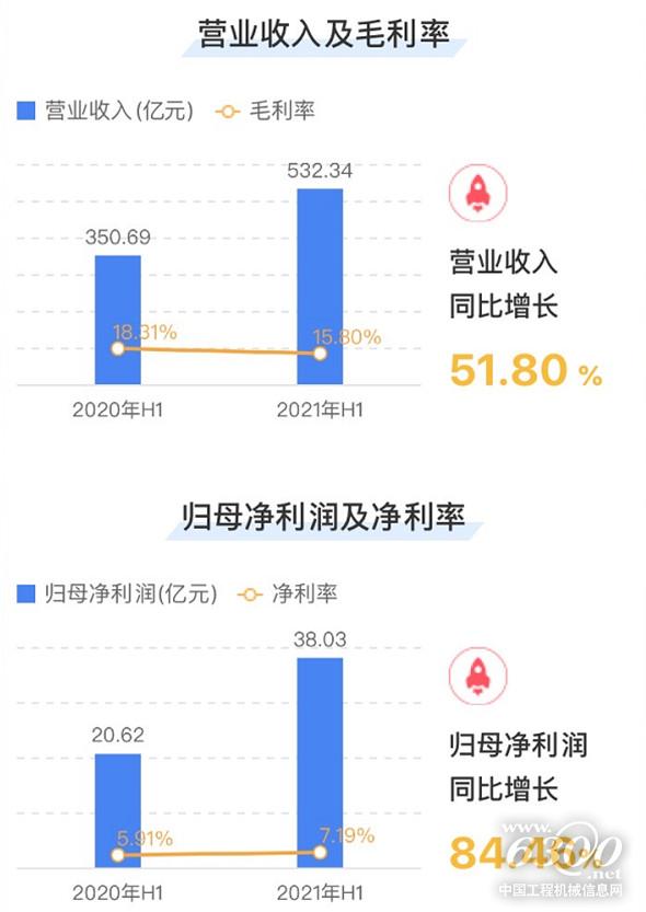 報告顯示,2021年上半年,徐工機械實現(xiàn)營業(yè)收入532.34億元,比上年同期增長51.8%;實現(xiàn)歸屬于上市公司股東的凈利潤38.03億元,比上年同期增長84.46%;經(jīng)營活動產(chǎn)生的現(xiàn)金流量凈額37.51億元,比上年同期增長648.58%。
