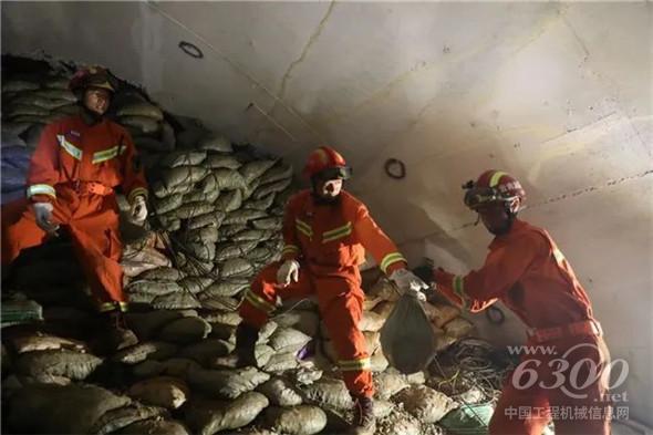 △救援人員正在搬運(yùn)砂石袋對(duì)隧道頂部進(jìn)行加固