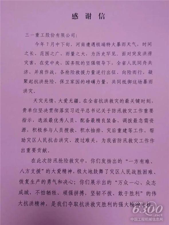 災后重建工程完成后,為感謝三一重工對河南抗洪救災做出的重大貢獻,河南防汛抗旱指揮部向三一重工送來了誠摯的感謝信。