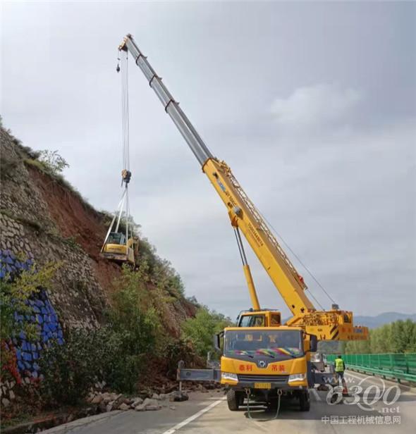 1臺徐工25噸起重機在晉中平遙,全力搶修平遙到榆社高速段因山體滑坡而造成的受損道路,爭取早日保證道路暢通,提高救援效率。