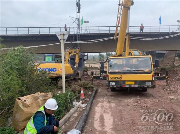 1臺徐工20噸起重機在晉中祁縣進行汾河108國道邊堤壩加固,為抗洪提供堅實的屏障,保障人民生命財產(chǎn)安全。
