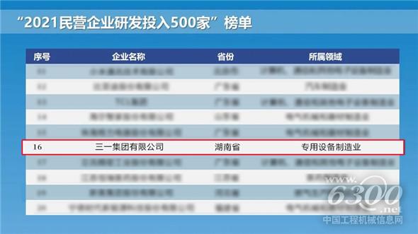 10月11日,全國(guó)工商聯(lián)發(fā)布“2021民營(yíng)企業(yè)研發(fā)投入500家”“2021民營(yíng)企業(yè)發(fā)明專(zhuān)利500家”榜單,三一集團(tuán)高位入選,分別排名第16、第7,均居專(zhuān)用設(shè)備制造業(yè)第一。