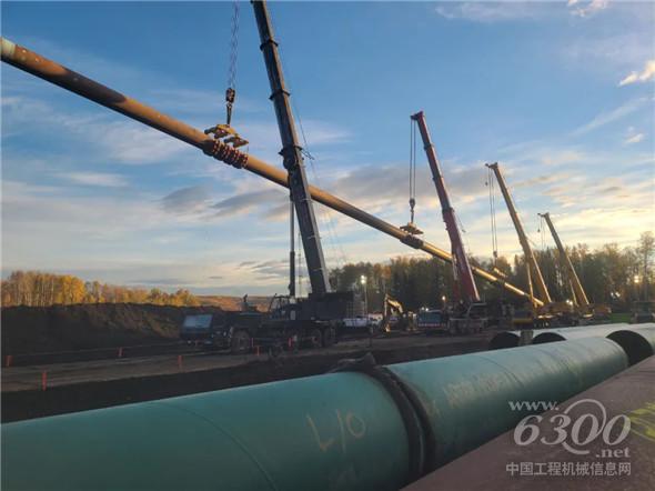近日,在加拿大Grande Prairie市石油天然氣管道鋪設(shè)項目現(xiàn)場,隨著現(xiàn)場指揮員一聲號令,徐工XCA275U與一排的利勃海爾、馬尼托瓦克大噸位起重機組成聯(lián)合施工集群,合力高舉,緩緩下落,綿延數(shù)百米遠(yuǎn)的天然氣管道被放置到指定位置。