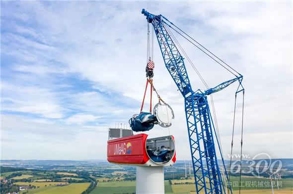 可不斷調(diào)整的V-型架配重半徑使得涂有藍(lán)色油漆的Hofmann公司的起重機(jī)能夠在帕德伯恩施工現(xiàn)場(chǎng)相對(duì)較小的空間內(nèi)工作,甚至可以回轉(zhuǎn)自如。為了安裝風(fēng)機(jī)部件,兩名駕駛員隨后將履帶起重機(jī)轉(zhuǎn)向靠近風(fēng)機(jī)塔筒的位置——在半徑26米將所有部件安裝完成。即便是吊鉤上承受最重的負(fù)載,即72噸的機(jī)艙和比其重3噸的傳動(dòng)系統(tǒng),也沒(méi)出現(xiàn)任何問(wèn)題。