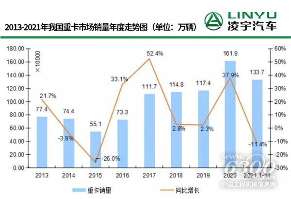 2013-2021年我國重卡市場銷量年度走勢圖(單位:萬輛)