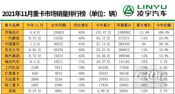 具體來看,在由解放、東風和重汽組成的重卡第一陣營中,一汽解放11月份銷售重卡約0.75萬輛;今年1-11月,解放重卡累計銷量超過33萬輛(33.2萬輛),市場占有率為24.9%,繼續(xù)保持重卡行業(yè)冠軍位置。