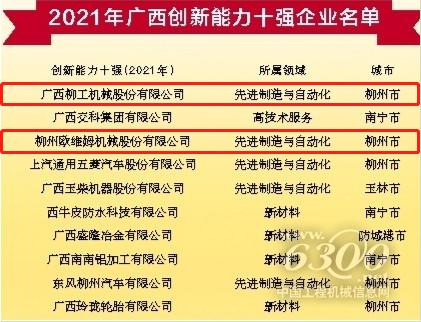 3. 柳工入選2021年廣西高新技術企業(yè)百強、創(chuàng)新能力十強;