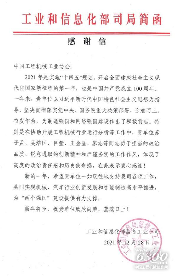 近日,工業(yè)和信息化部裝備工業(yè)一司致函中國工程機械工業(yè)協(xié)會,對協(xié)會一年來,堅持以習(xí)近平新時代中國特色社會主義思想為指導(dǎo),堅決貫徹落實黨中央、國務(wù)院重大決策部署,迎難而上,奮發(fā)作為,在制造強國和網(wǎng)絡(luò)強國建設(shè)工作,特別是積極配合協(xié)助開展工程機械行業(yè)運行分析等工作表示感謝!以下為感謝信全文: