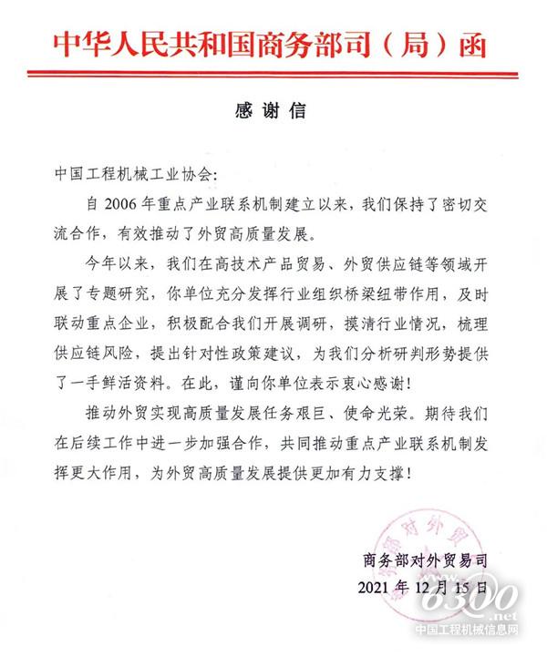 近日,商務(wù)部對(duì)外貿(mào)易司致函中國(guó)工程機(jī)械工業(yè)協(xié)會(huì),就協(xié)會(huì)今年以來(lái),積極配合商務(wù)部對(duì)外貿(mào)易司在高技術(shù)產(chǎn)品貿(mào)易、外貿(mào)供應(yīng)鏈等領(lǐng)域開(kāi)展了專(zhuān)題研究,收集、整理了大量的行業(yè)外貿(mào)進(jìn)出口情況,受到了高度的肯定。并指出,協(xié)會(huì)充分發(fā)揮行業(yè)組織橋梁紐帶作用,及時(shí)聯(lián)動(dòng)重點(diǎn)企業(yè),積極配合商務(wù)部對(duì)外貿(mào)易司開(kāi)展調(diào)研,摸清行業(yè)情況,梳理供應(yīng)鏈風(fēng)險(xiǎn),提出針對(duì)性政策建議,為商務(wù)部對(duì)外貿(mào)易司分析研判形勢(shì)提供了一手鮮活資料。在此,謹(jǐn)向協(xié)會(huì)表示衷心感謝!