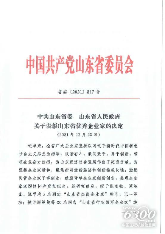 近日,山東省委、省政府發(fā)布了關(guān)于表彰山東省優(yōu)秀企業(yè)家的決定,臨工集團(tuán)董事長(zhǎng)王志中榮獲“山東省行業(yè)領(lǐng)軍企業(yè)家”稱號(hào),記一等功。