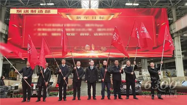 2月5日8點18分,泵送公司總經(jīng)理陳添明、副總經(jīng)理兼制造部部監(jiān)劉志福、泵送公司全體同仁相聚在18號廠房,揮舞旗幟奔向新年目標(biāo),喜迎2022年新春第一臺泵車下線!