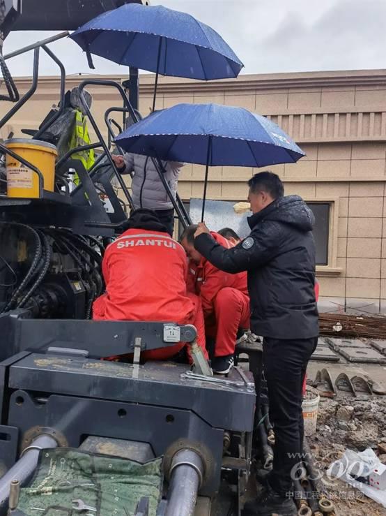 ▌整機檢查完畢后,發(fā)現(xiàn)熨平板伸縮油缸自動停車后會滑出,他們帶著整改件進行更換。張老板為服務人員打著傘,服務人員按照操作規(guī)程,熟練拆下連接線路及軟管,更換完畢后,測試沒有問題才離開張老板的施工地。服務人員冒雨又朝著下一個施工地出發(fā)……