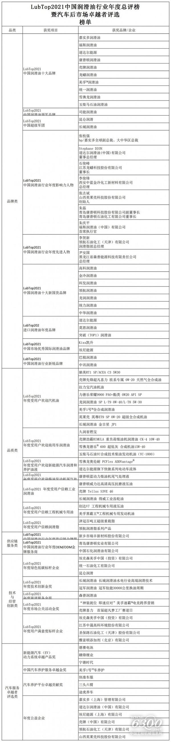3月28日,萬眾矚目的“LubTop2021中國潤滑油行業(yè)年度總評(píng)榜暨汽車后市場卓越者評(píng)選”頒獎(jiǎng)盛典云端全球發(fā)布。以“破維,拓新局”為主題的“LubTop2021總評(píng)榜”由中國潤滑油信息網(wǎng) (www.sinolub.com)、《潤滑油市場》雜志發(fā)起主辦,法蘭通聯(lián)展覽(北京)有限公司(AMR中國國際汽保汽配展主辦方)聯(lián)合主辦,業(yè)內(nèi)權(quán)威機(jī)構(gòu)和眾多主流媒體支持協(xié)辦,對(duì)包括在設(shè)備潤滑和汽車服務(wù)市場表現(xiàn)優(yōu)秀卓越的潤滑油產(chǎn)業(yè)鏈相關(guān)產(chǎn)品和服務(wù)進(jìn)行榮譽(yù)認(rèn)證。據(jù)組委會(huì)介紹,評(píng)選活動(dòng)以技術(shù)創(chuàng)新、市場表現(xiàn)、用戶滿意度、行業(yè)影響力等四大維度為品牌核心評(píng)價(jià)體系。在企業(yè)申報(bào)資格海選,第三方權(quán)威機(jī)構(gòu)質(zhì)量檢測結(jié)果(一票否決權(quán))基礎(chǔ)上,通過線上用戶投票、專業(yè)市場調(diào)研、專家導(dǎo)師團(tuán)評(píng)審、媒體觀察評(píng)議流程,以線上線下大數(shù)據(jù)+智能算法產(chǎn)生LubTop品牌榮譽(yù)指數(shù),確定LubTop2021總評(píng)榜暨汽車服務(wù)卓越者榜單。全球一線潤滑油品牌嘉實(shí)多、美孚、殼牌,中國超級(jí)軍團(tuán)長城潤滑油、昆侖潤滑等世界五百強(qiáng)企業(yè)品牌獲得“LubTop總評(píng)榜”行業(yè)大獎(jiǎng)。