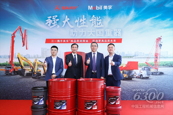 (從右至左) 三一集團(tuán)總裁助理、商務(wù)總部戰(zhàn)略采購(gòu)部部長(zhǎng)廖俊宇先生、三一重工工程車輛事業(yè)部營(yíng)銷公司副總經(jīng)理何發(fā)良先生、??松梨冢ㄖ袊?guó))投資有限公司企業(yè)用戶業(yè)務(wù)總經(jīng)理?xiàng)顤|先生與廣州易工品科技有限公司華中大區(qū)總經(jīng)理米騰先生共同宣布三一-美孚聯(lián)合品牌高性能潤(rùn)滑油正式發(fā)布