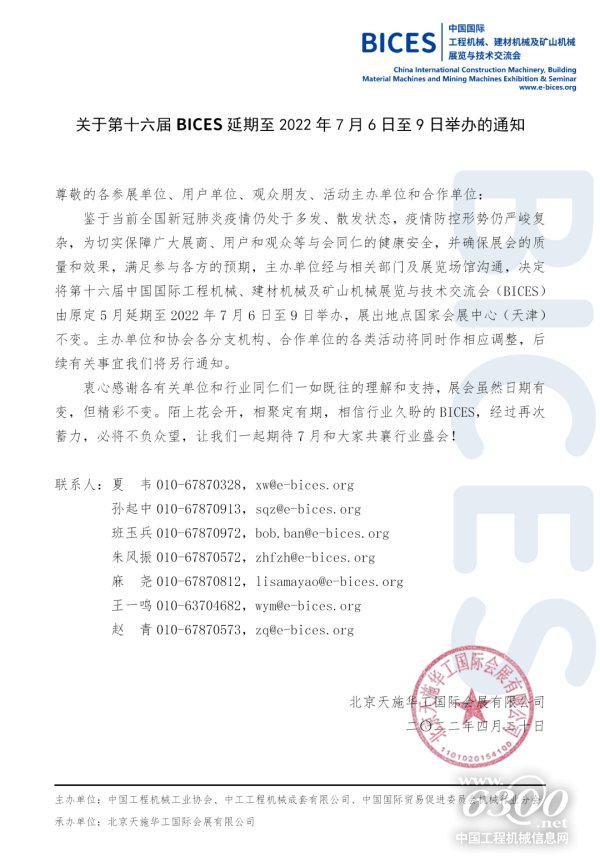 尊敬的各參展單位、用戶單位、觀眾朋友、活動主辦單位和合作單位: 鑒于當(dāng)前全國新冠肺炎疫情仍處于多發(fā)、散發(fā)狀態(tài),疫情防控形勢仍嚴峻復(fù)雜,為切實保障廣大展商、用戶和觀眾等與會同仁的健康安全,并確保展會的質(zhì)量和效果,滿足參與各方的預(yù)期,主辦單位經(jīng)與相關(guān)部門及展覽場館溝通,決定將第十六屆中國國際工程機械、建材機械及礦山機械展覽與技術(shù)交流會(BICES)由原定5月延期至2022年7月6日至9日舉辦,展出地點國家會展中心(天津)不變。主辦單位和協(xié)會各分支機構(gòu)、合作單位的各類活動將同時作相應(yīng)調(diào)整,后續(xù)有關(guān)事宜我們將另行通知。 衷心感謝各有關(guān)單位和行業(yè)同仁們一如既往的理解和支持,展會雖然日期有變,但精彩不變。陌上花會開,相聚定有期,相信行業(yè)久盼的BICES,經(jīng)過再次蓄力,必將不負眾望,讓我們一起期待7月和大家共襄行業(yè)盛會! 聯(lián)系人:夏韋010-67870328,xw@e-bices.org 孫起中010-67870913,sqz@e-bices.org班玉兵010-67870972,bob.ban@e-bices.org朱風(fēng)振010-67870572,zhfzh@e-bices.org 麻堯010-67870812,lisamayao@e-bices.org王一鳴010-63704682,wym@e-bices.org趙青010-67870573,zq@e-bices.org