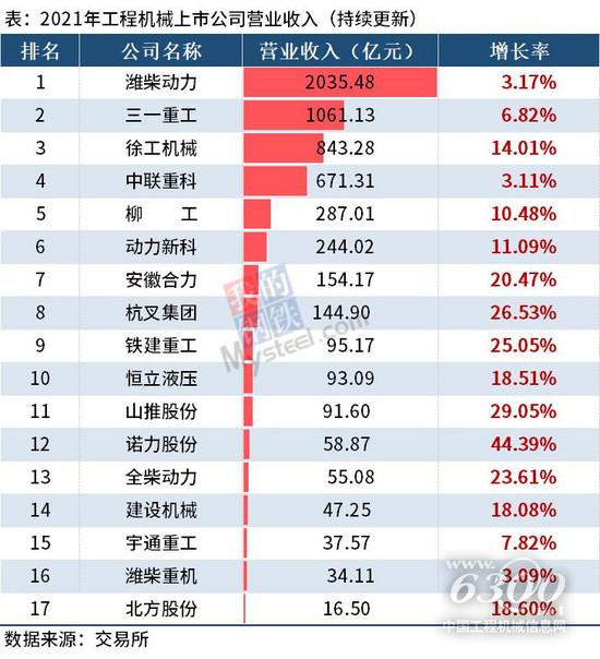 2. 17家工程機械企業(yè)公布2021年業(yè)績,濰柴、三一分列營收和凈利第一;