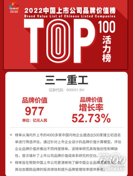 5月10日,每經(jīng)品牌100(指數(shù))上線儀式暨2022中國上市公司品牌價(jià)值榜發(fā)布會(huì)舉行。會(huì)上,三一重工以977.49億元的品牌價(jià)值,位列“2022中國上市公司品牌價(jià)值榜”總榜第40名,第4次入圍中國品牌價(jià)值榜,較上年躍升19個(gè)名次,穩(wěn)居工程機(jī)械行業(yè)第一。