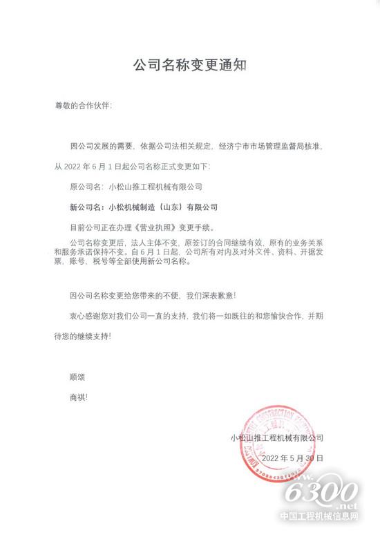 因公司發(fā)展需要,“小松山推工程機(jī)械有限公司”(以下簡稱:小松山推)于2022年6月1日正式更名為“小松機(jī)械制造(山東)有限公司”,詳情請(qǐng)參閱以下小松山推更名通知,特此公告。