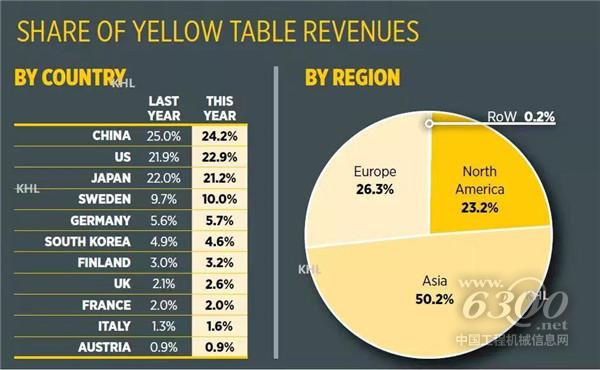 Yellow Table 2022榜單中,中國工程機械企業(yè)銷售額占總銷售額24.2%,是占比最高的國家;美國工程機械企業(yè)占總銷售額22.9%;日本工程機械市場占總銷售額21.2%。(Yellow Table表中的數(shù)據(jù)顯示的是所列公司的營業(yè)收入,不代表一個地區(qū)自身的或一個國家整體的營收表現(xiàn)。另外該榜單數(shù)據(jù)范圍基于2021自然年,但在日本、印度以及其它的一些國家,數(shù)據(jù)范圍為2021財年,即2021年4月1日至2022年3月31日。)