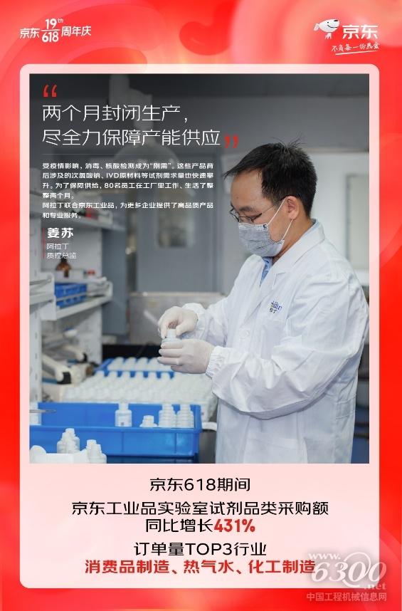 京東618開啟后,阿拉丁繼續(xù)攜手京東工業(yè)品為更多企業(yè)提供了高品質(zhì)產(chǎn)品和專業(yè)服務(wù)。京東618期間,京東工業(yè)品實(shí)驗(yàn)室試劑品類采購額同比增長431%,訂單量TOP3行業(yè)為消費(fèi)品制造、熱氣水和化工制造,訂單量同比增長均超過100%。
