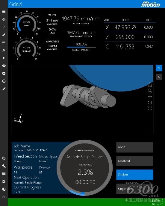在CyGrind中,MPG進(jìn)給功能可用于生產(chǎn)前設(shè)置,并檢測(cè)潛在的問題,如砂輪與工件的碰撞風(fēng)險(xiǎn)。