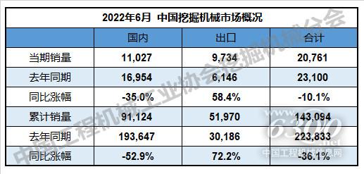 2022年6月挖掘機(jī)國(guó)內(nèi)銷量11027臺(tái),同比下降35%
