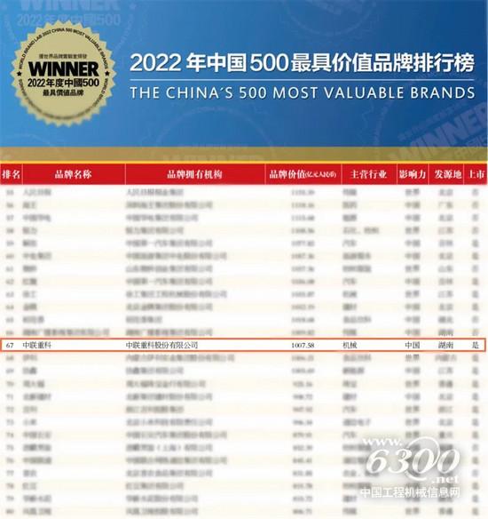 ▲中聯(lián)重科品牌價值突破1000億元,排名67位