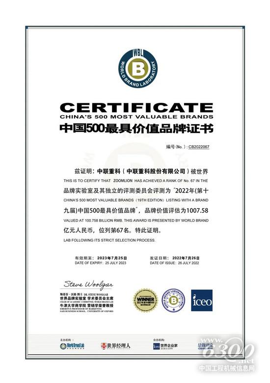 7月26日,由世界品牌實(shí)驗(yàn)室(World Brand Lab)主辦的第十九屆“世界品牌大會(huì)”在北京舉行,會(huì)上發(fā)布了2022年《中國(guó)500最具價(jià)值品牌》分析報(bào)告。中聯(lián)重科以1007.58億元品牌價(jià)值上榜,較去年大幅提升141.83億元。這是中聯(lián)重科連續(xù)19年榮登《中國(guó)500最具價(jià)值品牌》榜,并突破千億元大關(guān),既充分彰顯了中聯(lián)重科持續(xù)攀升的品牌影響力,也極致凸顯了中聯(lián)重科作為我國(guó)裝備制造龍頭企業(yè)的品牌引領(lǐng)力。