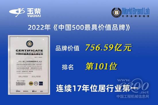 7月26日,由世界品牌實(shí)驗(yàn)室主辦的“2022(第十九屆)世界品牌大會(huì)”在北京舉行,會(huì)上發(fā)布了2022年《中國(guó)500最具價(jià)值品牌》分析報(bào)告。玉柴品牌價(jià)值756.59億元,同比去年提升近120億元,位居榜單第101位,連續(xù)17年領(lǐng)跑內(nèi)燃機(jī)行業(yè)。