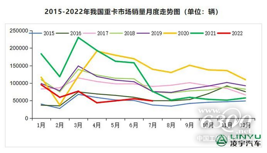 據(jù)統(tǒng)計,今年7月份,我國重卡市場大約銷售4.9萬輛左右(開票口徑),環(huán)比今年6月下降11%,比上年同期的7.63萬輛下降36%,凈減少2.73萬輛。4.9萬輛是自2016年以來7月份銷量的最低點,比2016年7月銷量(4.97萬輛)還要略低。