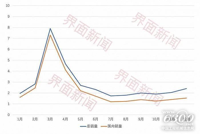 挖掘機(jī)去年銷(xiāo)量走勢(shì) 單位:萬(wàn)臺(tái) 數(shù)據(jù)來(lái)源:中國(guó)工程機(jī)械工業(yè)協(xié)會(huì) 制圖:馬悅?cè)?/p>