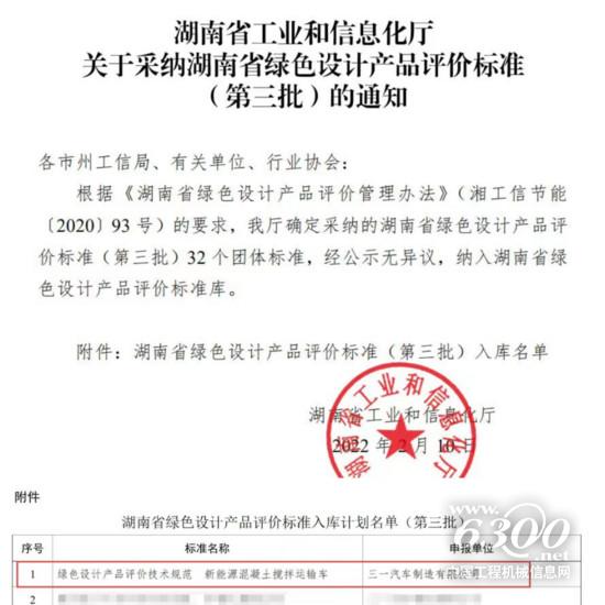年初,湖南省工業(yè)和信息廳對湖南省綠色設計產(chǎn)品名單進行公示,由三一汽車制造有限公司牽頭編制的《綠色設計產(chǎn)品評價技術規(guī)范 新能源混凝土攪拌運輸車》(T/CSTE 0029—2021)已被湖南省工信廳納入湖南省綠色設計產(chǎn)品評價標準庫(第三批)。