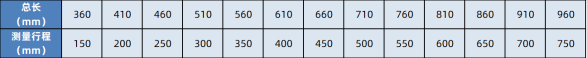 圖3: 緊湊型增量式直線時(shí)柵位移傳感器標(biāo)準(zhǔn)可選測量行程與尺寸對(duì)照表