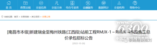 10月26日,《新建瑞金至梅州鐵路(江西段)站前工程RMJX-1~RMJX-4標段施工總價承包招標公告》(南鐵施招[2022]39號)及施工監(jiān)理公告正式發(fā)布。